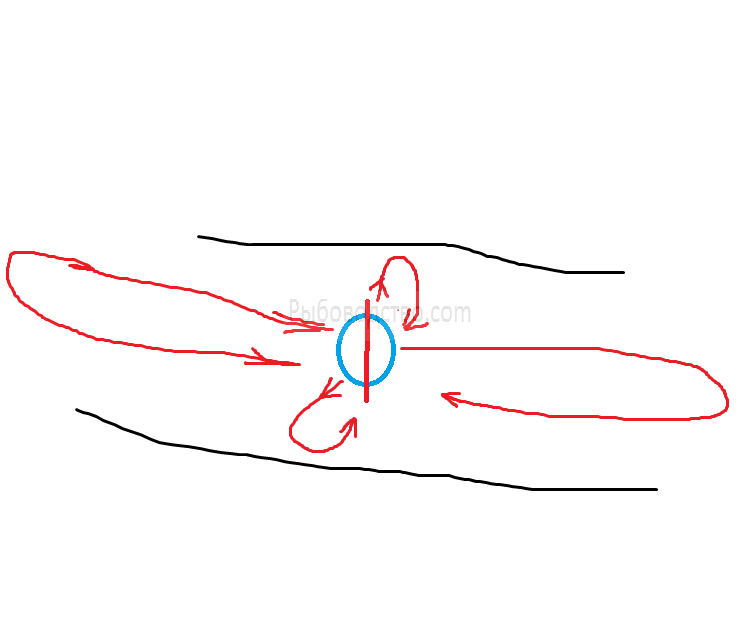 Схематично показал, , вид сверху, как воду разворачивает. По бокам упирается в бока канала, а по каналу какое расстояние идет и возращается.