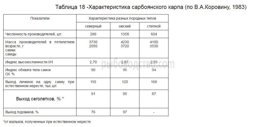 Относительная высота тела сарбоянского карп (1/h) составляет 2,6, отношение длины головы к длине тела (С/1) - 25%, коэффициент упитанности (Р/13) - 3,3 %, относительный обхват (0/1) - 85%. Самки имеют достаточно высокую плодовитость: при естественном нересте на одну самку степного типа получают 200-385 тыс. личинок.