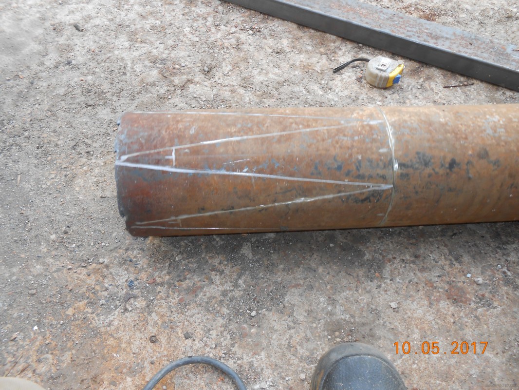 Чтобы вымерять и вычертить строго перпендикуляр оси трубы, использовал большой бумаги, оборачивая с перехлестом вокруг трубы.
