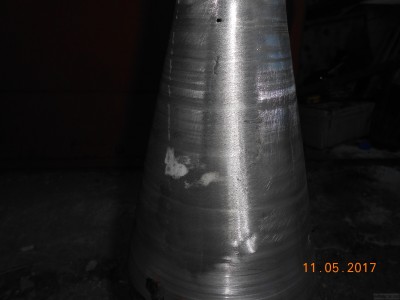 Сьездил к токарю и конус обточили. Я боялся, что от оси уйду, ничего в норме, хотя и на коленке делал все :), погрешность 3 мм :) Правда конус вручную гнали, из-за размера шаблона не смогли выставить угол на станке, получилось немного ребристо. Но попробовали мягким диском- эти ребра можно снять, что и сделаю завтра. Оказалось, что я швы не наскозь проварил, при обточке стало видно :).