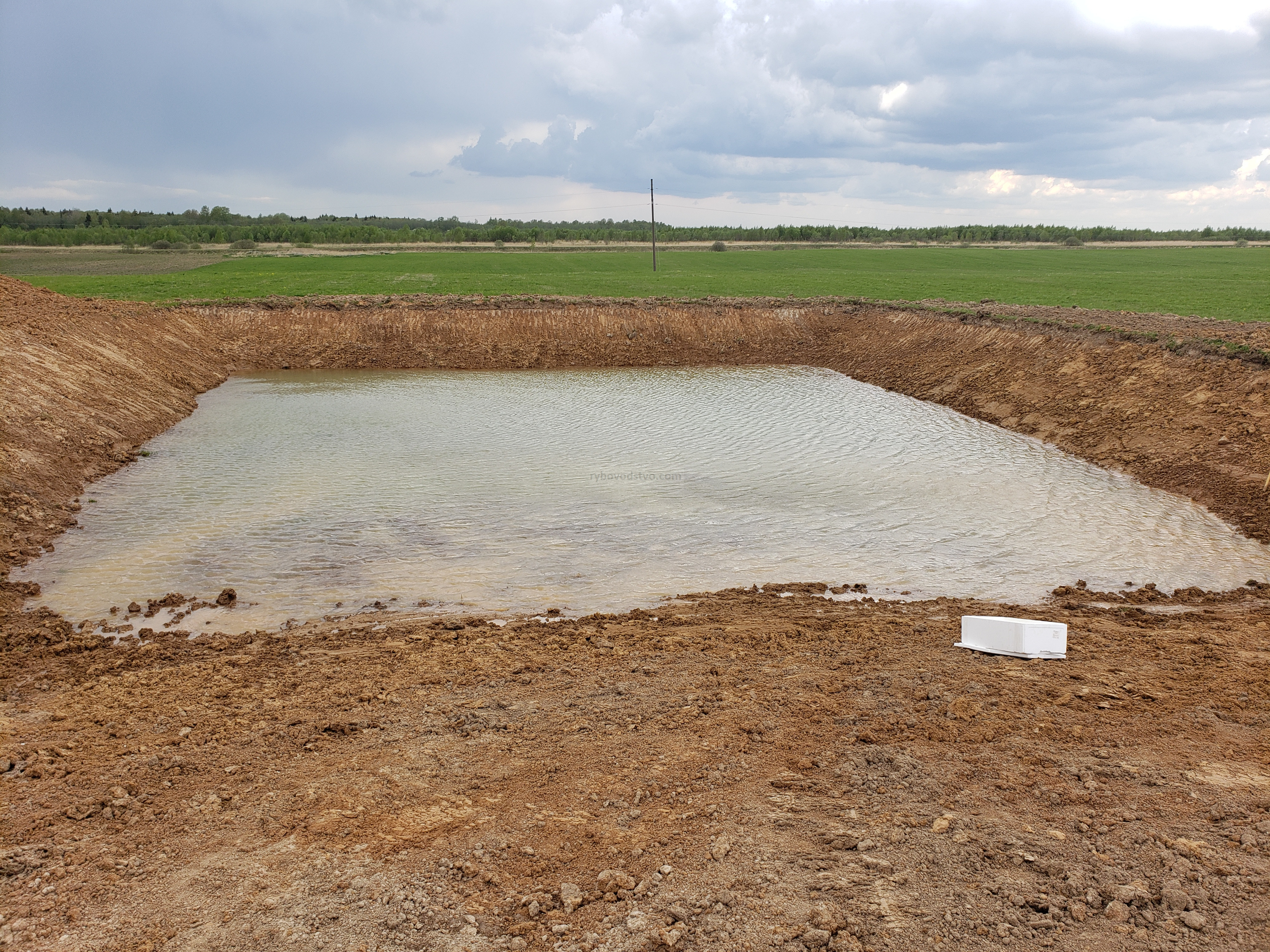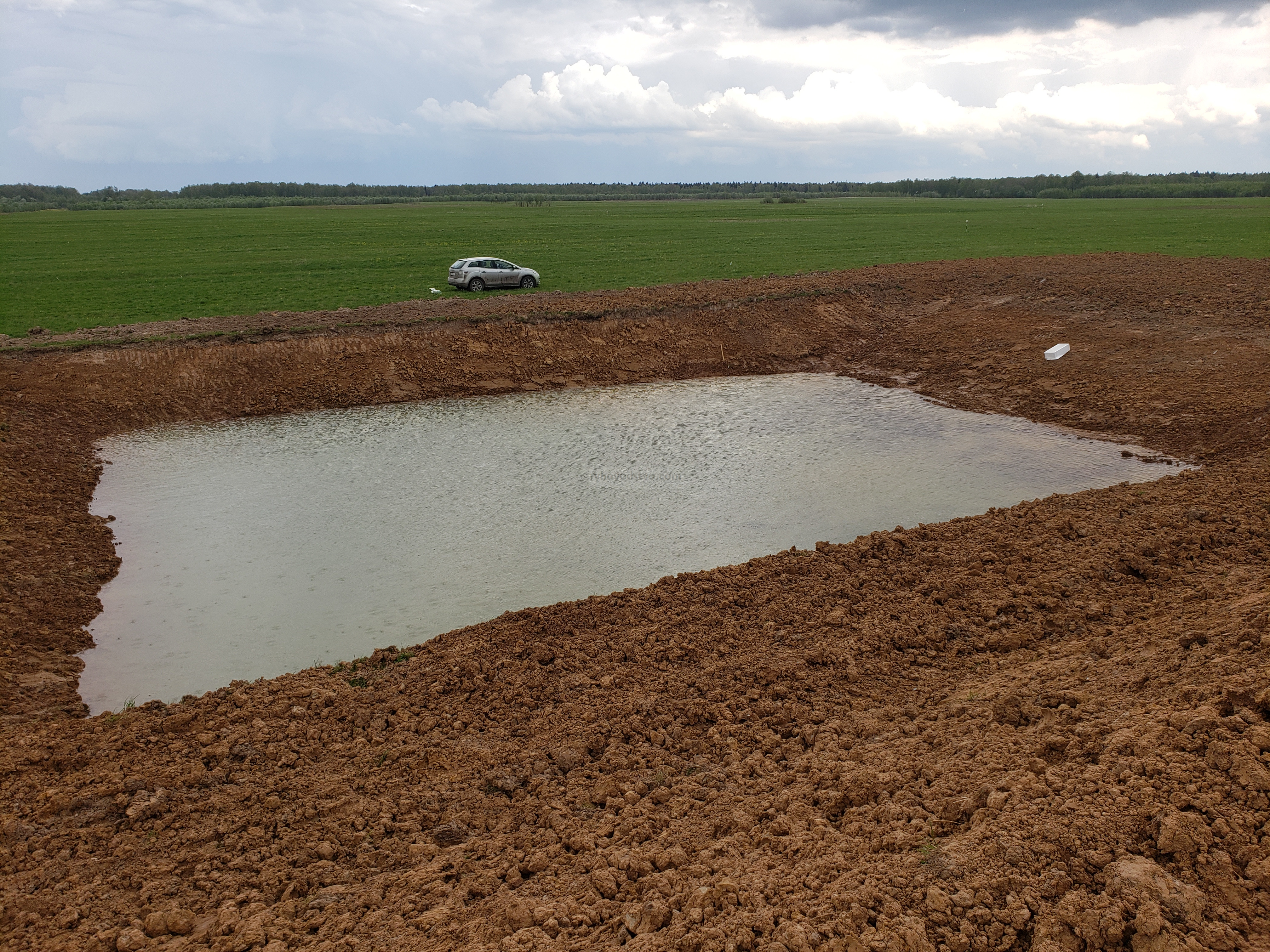 Участок представляет собой бывшее совхозное поле, мой участок размером 92Х115 метров. Пруд строю для себя, размер 25Х40 метров, глубина 3,7 метра (максимальная), 2,5 метра (минимальная). Рельеф поверхности земли разбитый под устройство пруда имел по длинной стороне уклон в 0,5 метра. Геологические изыскания вскрыли грунтовые воды на 3,4 метрах, напорные, вода поднимается до 1,5 метров, в период паводка, мной было зафиксировано значение 0.7 метра от уровня земли. Грунт по тем же геологическим изысканиям, до глубины в 1,5- 2 метра суглинок светло-коричневый, мягко пластичный, далее до 8-ми метров суглинок серый, туго пластичный.